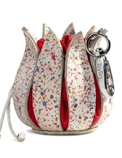 This exquisite Tulip handbag is the perfect accessory for any outfit. The handbag is crafted from classic leather, with a splash motif and red canvas between the flower pads. This handbag is designed to open like a flower, revealing a pocket inside for all your smaller items. It is big enough to fit all your essentials, but small enough to be carried comfortably.